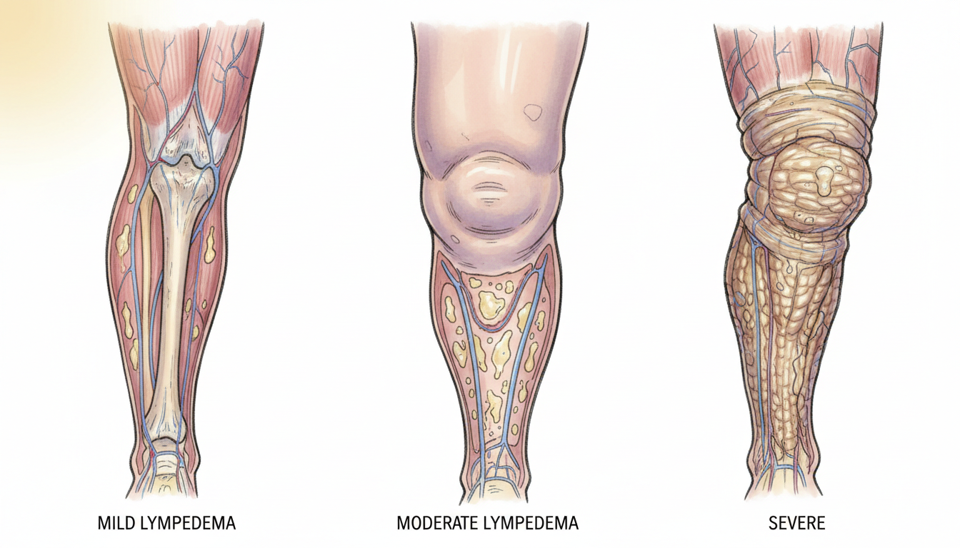 リンパ浮腫は進行性の疾患です。進行度合いによって、むくみ方や肌の状態が異なります。