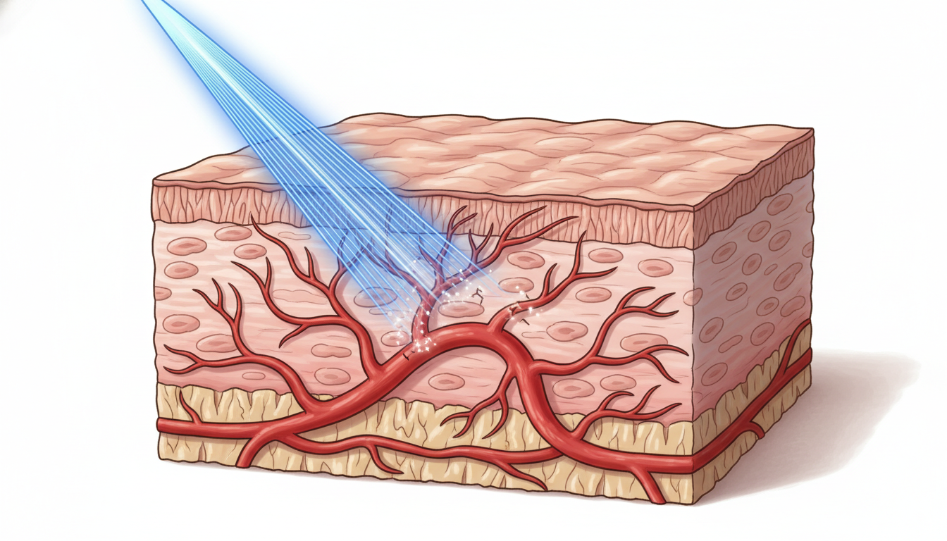 この理論では、特定の波長のレーザー光が標的組織(この場合は血管やヘモグロビン)にのみ選択的に吸収され、周囲の正常な組織への損傷を最小限に抑えながら治療効果を得ることができます。レーザー光が血管内のヘモグロビンに吸収されると、光エネルギーが熱エネルギーに変換されます。この熱により血管壁が凝固し、血管が収縮または閉塞します。拡張していた毛細血管が閉塞することで、皮膚表面に透けて見えていた赤みが改善されるという仕組みです。